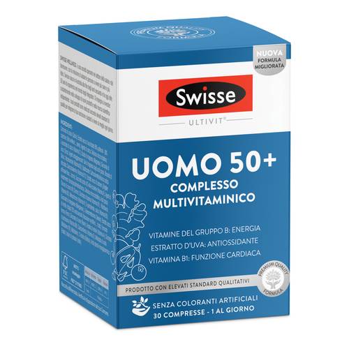 Swisse UOMO 50+COMPLESSO MULTIVITAMINICO Descrizione Complesso multivitaminico completo di qualità premium che combina 13 vitamine, 10 minerali e 3 estratti erbali accuratamente selezionati per integrare la nutrizione. Le vitamine del gruppo B contribuiscono al normale metabolismo energetico. L’estratto d’uva ha un'azione antiossidante. La vitamina B1 contribuisce alla normale funzione cardiaca. Ingredienti Carbonato di calcio (calcio), e.s. d’uva titolato 95% polifenoli - 38% catechine (Vitis vinifera L., seme); agente di carica: cellulosa microcristallina; L-ascorbato di calcio (vitamina C), ossido di magnesio (magnesio), g...